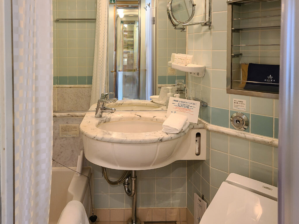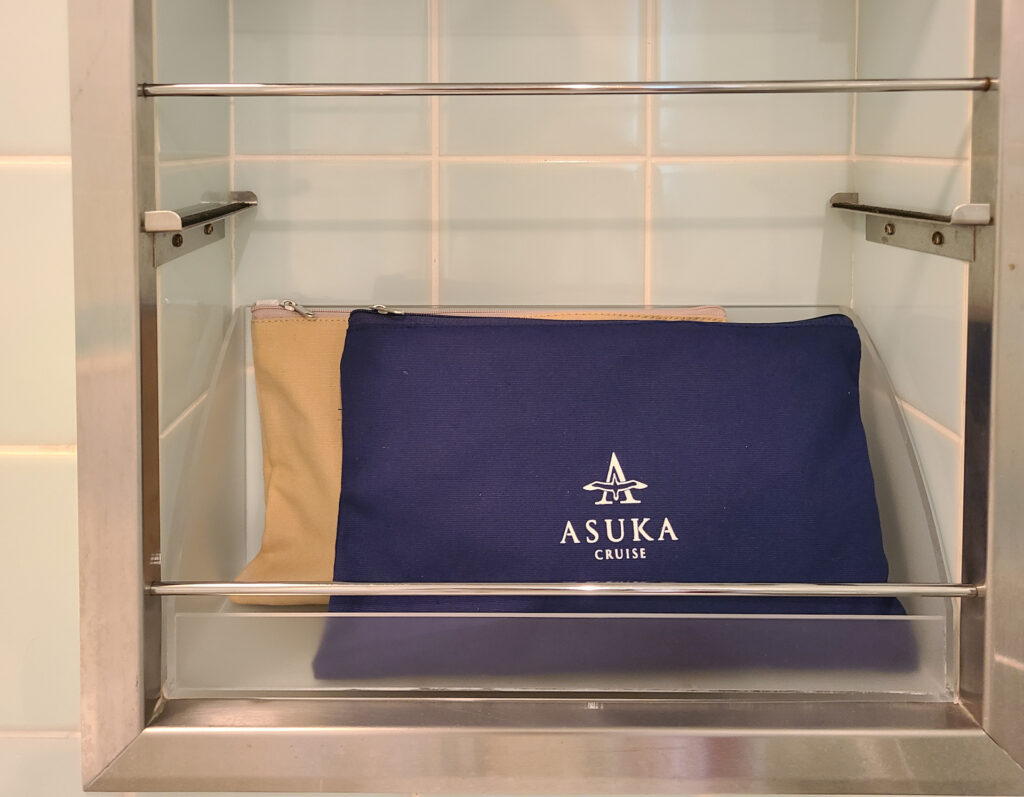バスルームには飛鳥クルーズオリジナルのポーチがあり、歯ブラシなどのアメニティが入っていました。
