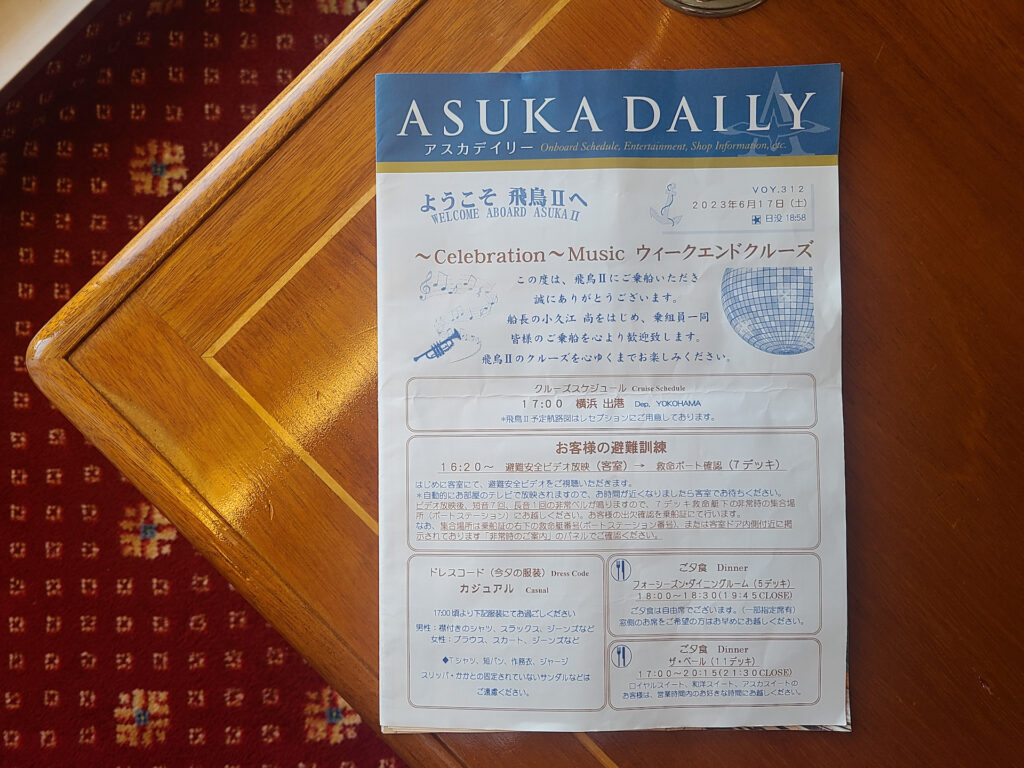 まずは、お部屋に用意されている『ASKA DAILY』という船内紙をチェックしましょう。