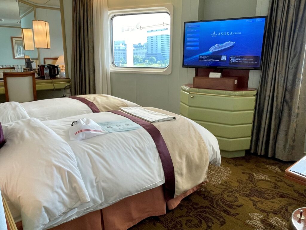 疲れたときは客室に戻って休憩するなど自分たちのペースで過ごせるのが船旅の魅力の一つですが、今回は親の方が寝落ち。その理由は、全客室に導入されている「飛鳥Ⅱ」と「シモンズ」の共同開発マットレスのクオリティにありました。