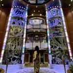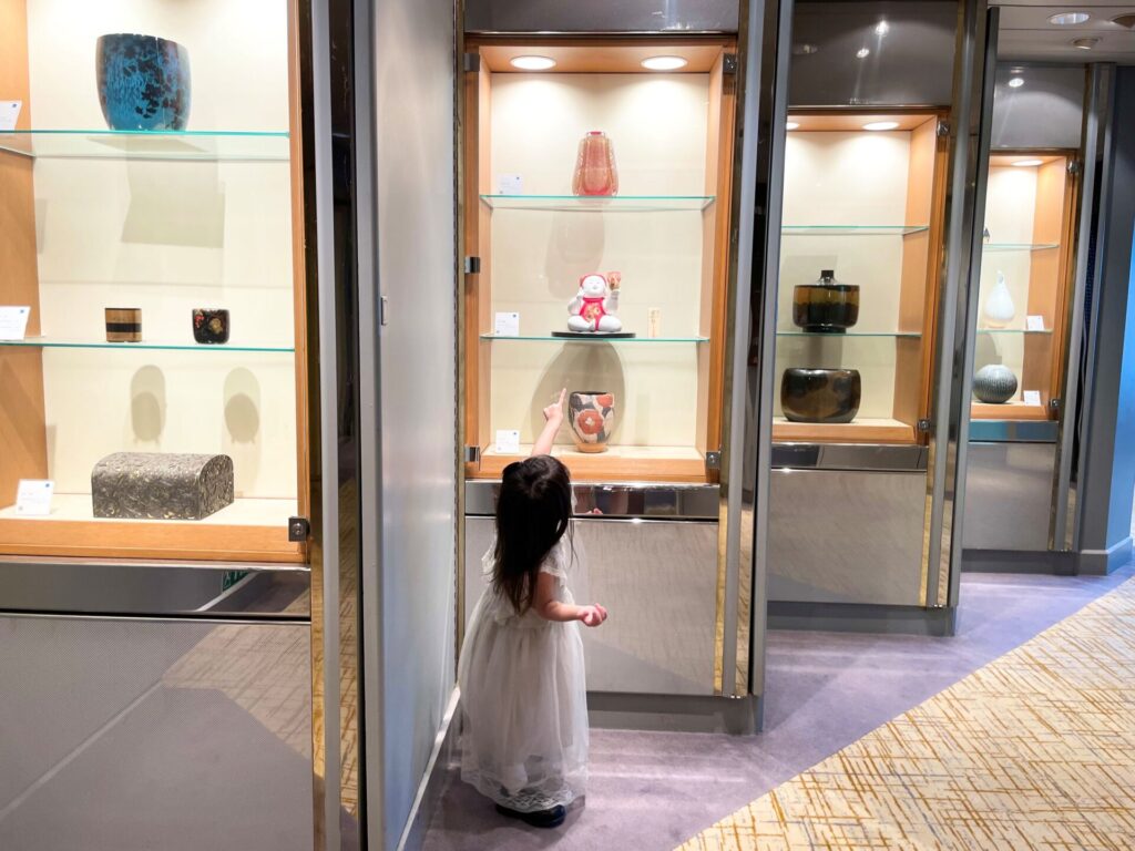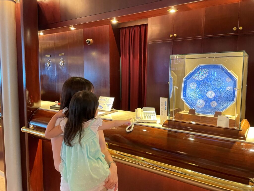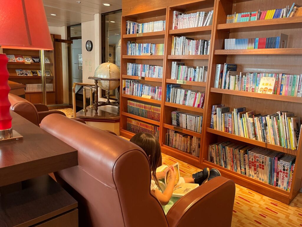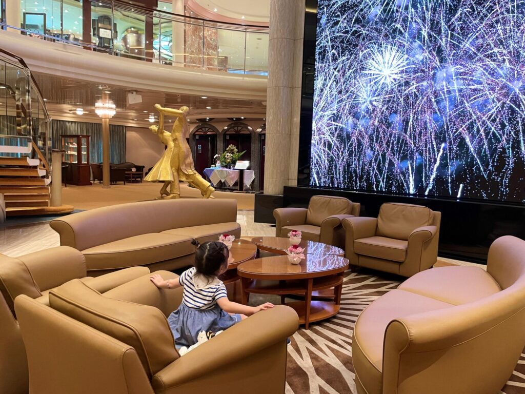 今回のお気に入りスポットはメインロビー。季節を感じる映像や寄港地の風景が流れており、子供も釘付けになり入り浸り。重厚感のあるこのソファーがとても寛げる場所で、子供が一緒なことで他のお客様とも関わり合いが持ちやすく、孫のように可愛がっていただきました。