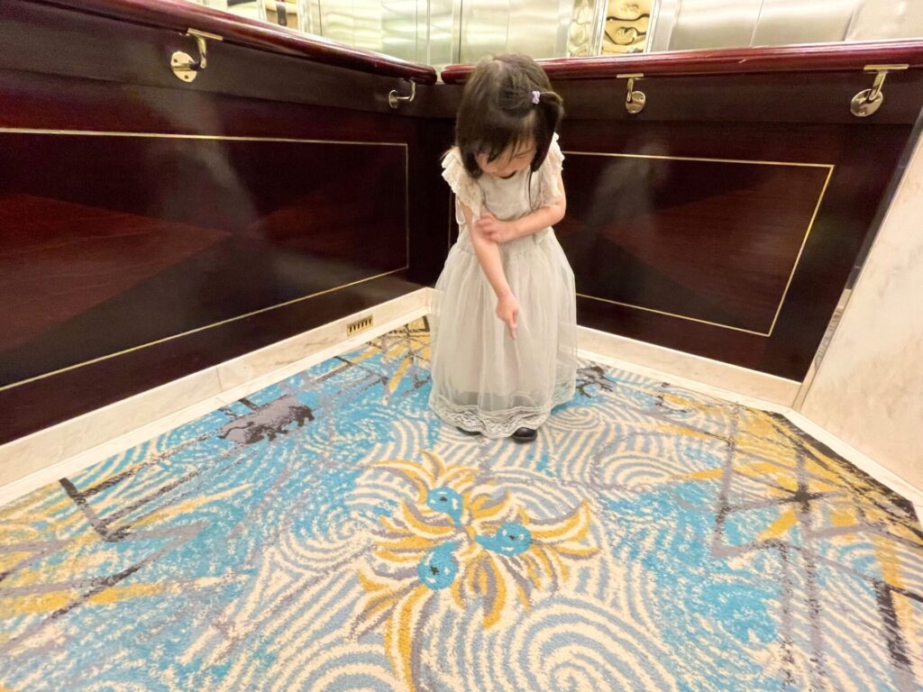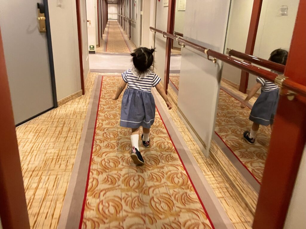 絨毯の模様に注目したり、(飛鳥Ⅱの船内は一人あたりの平米数が大きいので)多少走り回ってもまぁ許されるというか、目も行き届きやすく子連れも安心です。
