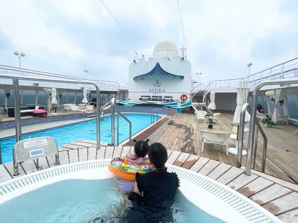 プールからの温水ジャグジーでゆったり。外国客船に比べると、プールサイドは人があまりいないので穴場です。すっかりジャグジーも大好きになりました!