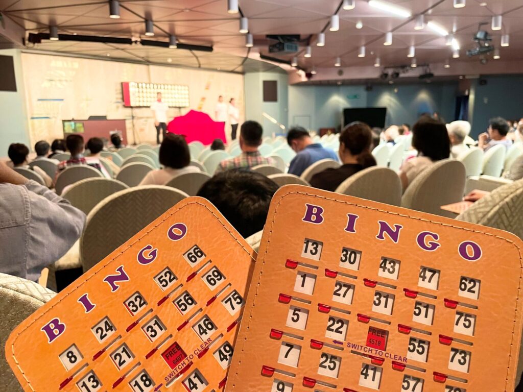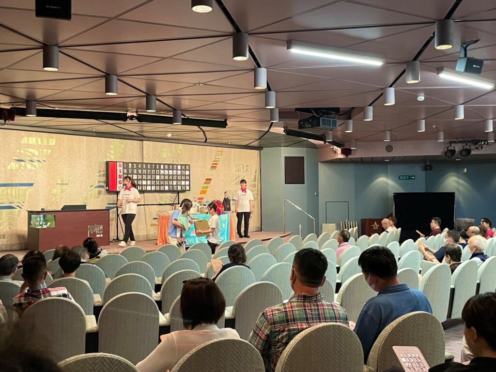 その他、船内イベントは社交ダンス、ウォーキングやスポーツゲーム、アクセサリー等のカルチャー教室などが用意されてますが、全員におすすめしたいのは、ビンゴ大会!なんと無料で楽しめるのです。景品は飛鳥Ⅱのオリジナルグッズ!!