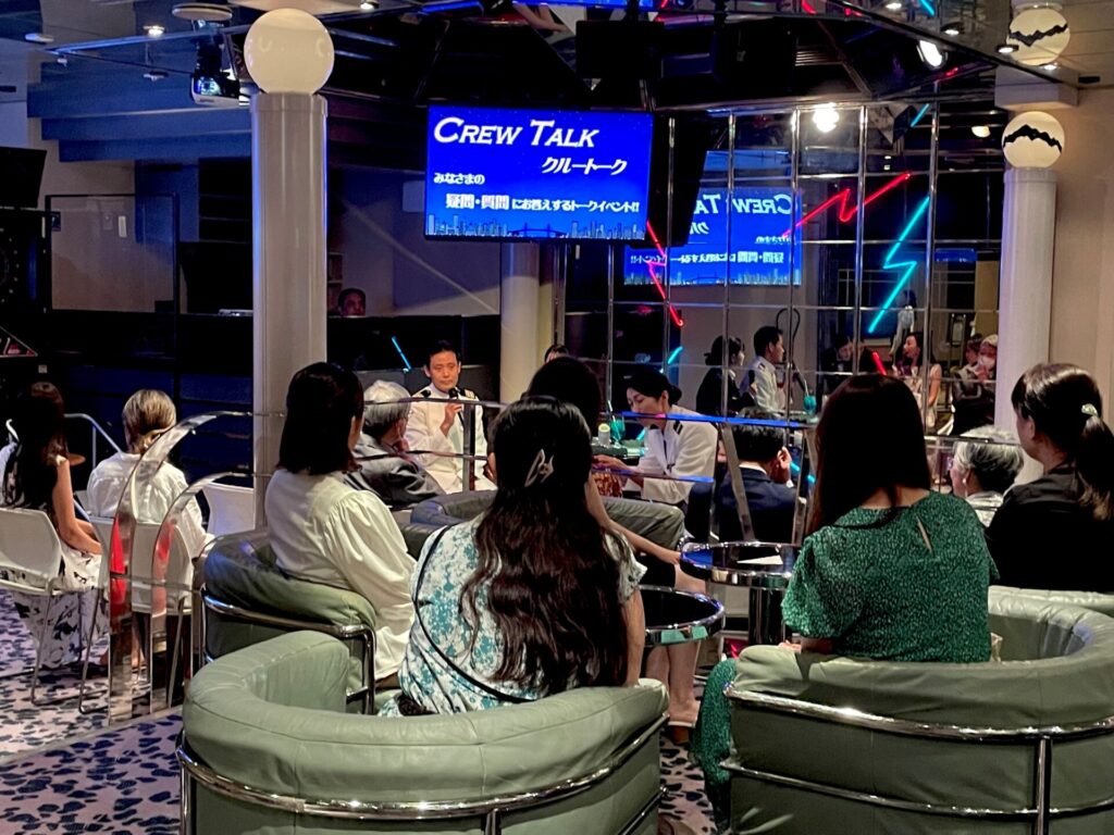 夜はドリンク片手にクルートークに参加!船や乗組員の生活に関わる素朴な質問までQ&A形式で盛り上がり、貴重な機会でした。