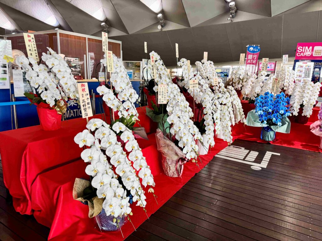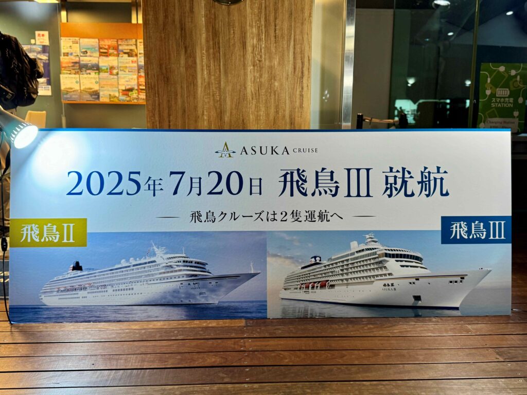 大さん橋クルーズターミナルでは、「飛鳥Ⅲ」就航を祝う看板が用意されていました。
