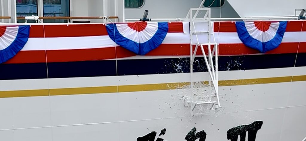 命名者を務めたのは、日本郵船社長夫人・曽我多美子さん。彼女の声で「飛鳥Ⅲ」という名前が正式に告げられた瞬間、船体にシャンパンを瓶ごと打ち付け「シャンパンスプラッシュ」が行われました。