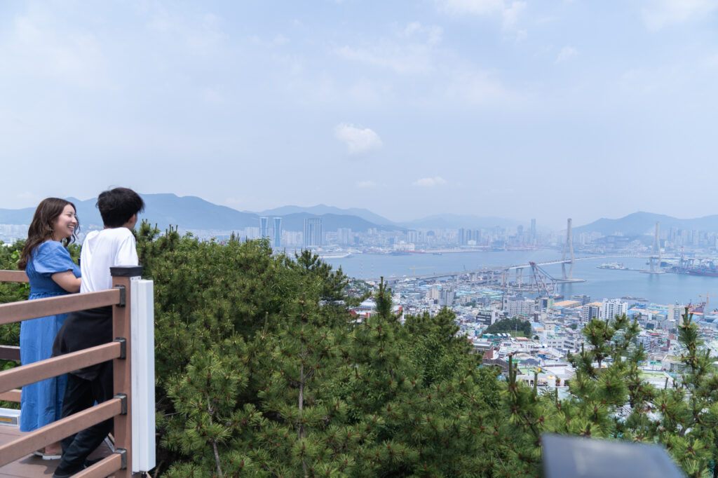 階段を上がると、ふいに視界が開けて、白いアーチを描く釜山港大橋と、港町らしい景色が目の前いっぱいに広がります。思わず「わぁ」と声がもれるほどの解放感。