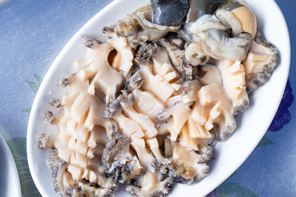 アワビはほどよい歯ざわりで、添えられたごま油を少しつけると香ばしさが立ち上がり、海のミネラル感がぐっと引き締まります。