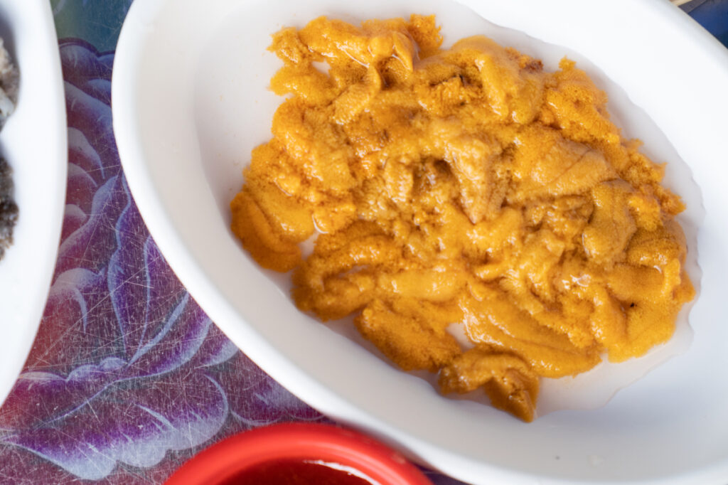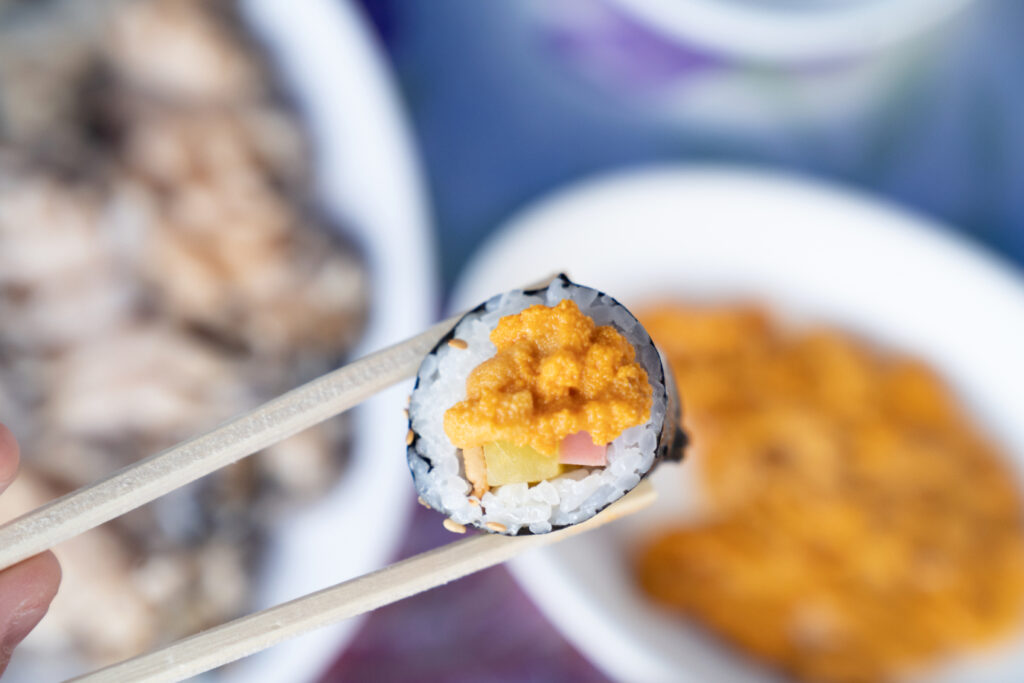名物のウニキンパは、届いたキンパにウニを自分で好きなだけのせて仕上げるセルフ式です。