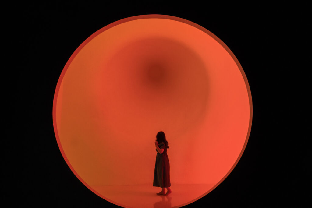 館内でも特に人気のフォトスポットのひとつ。光の中心に立つと、まるで自分自身が太陽の核に包まれているかのような構図を体験できます。