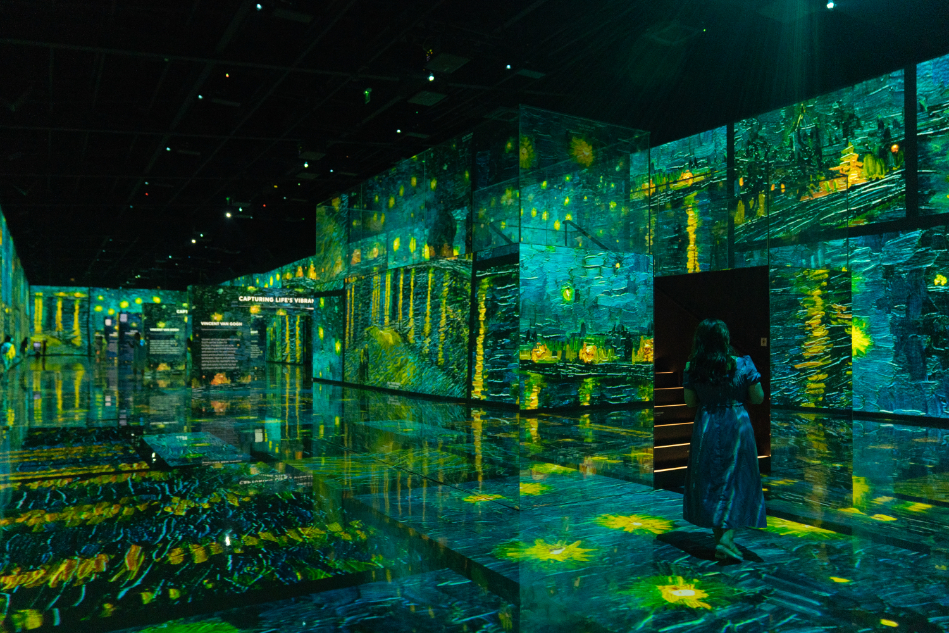フランス・オルセー美術館に収蔵されている名作たちが、音楽と映像の波に乗って動き出す空間。壁一面に広がるゴッホの筆致は、絵の厚みや揺らぎまでそのまま生きていて、クラシック音楽の旋律に合わせてゆっくりと姿を変えていきます。