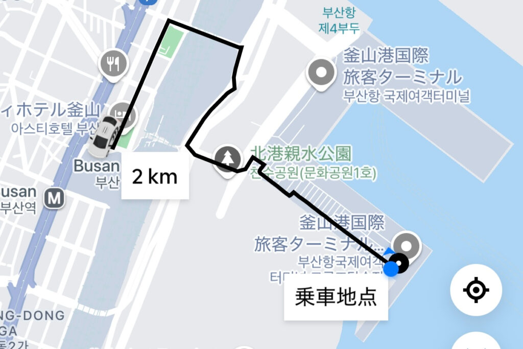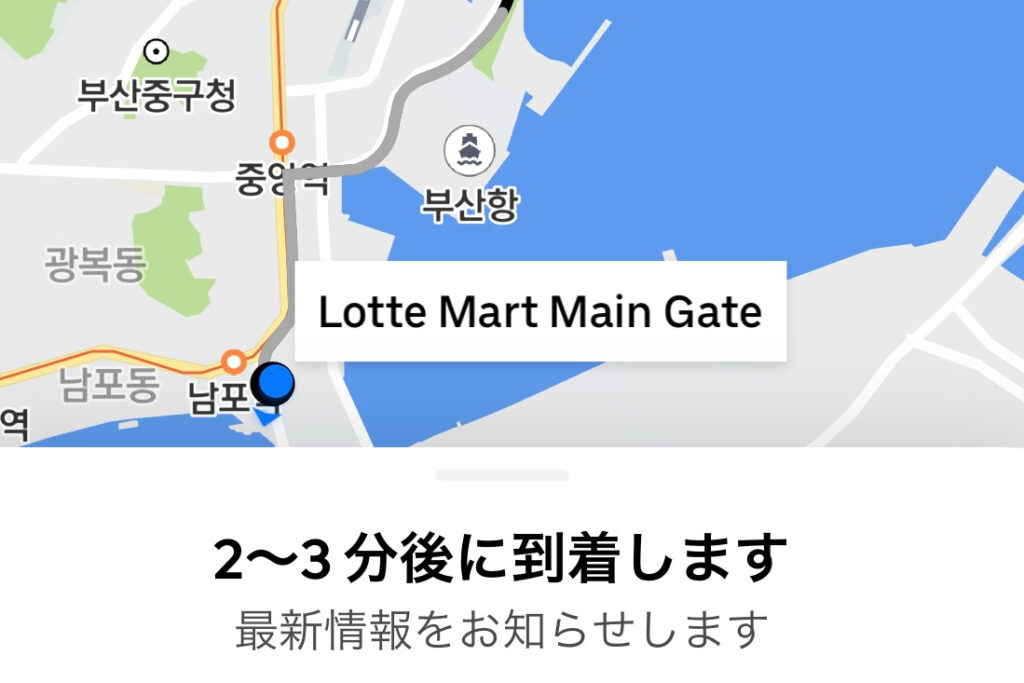 「ロッテマート 光復店」から釜山港ターミナルまでは、Uberでおよそ8分。思ったより近く、無事に到着できました。