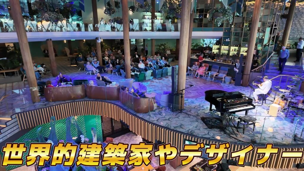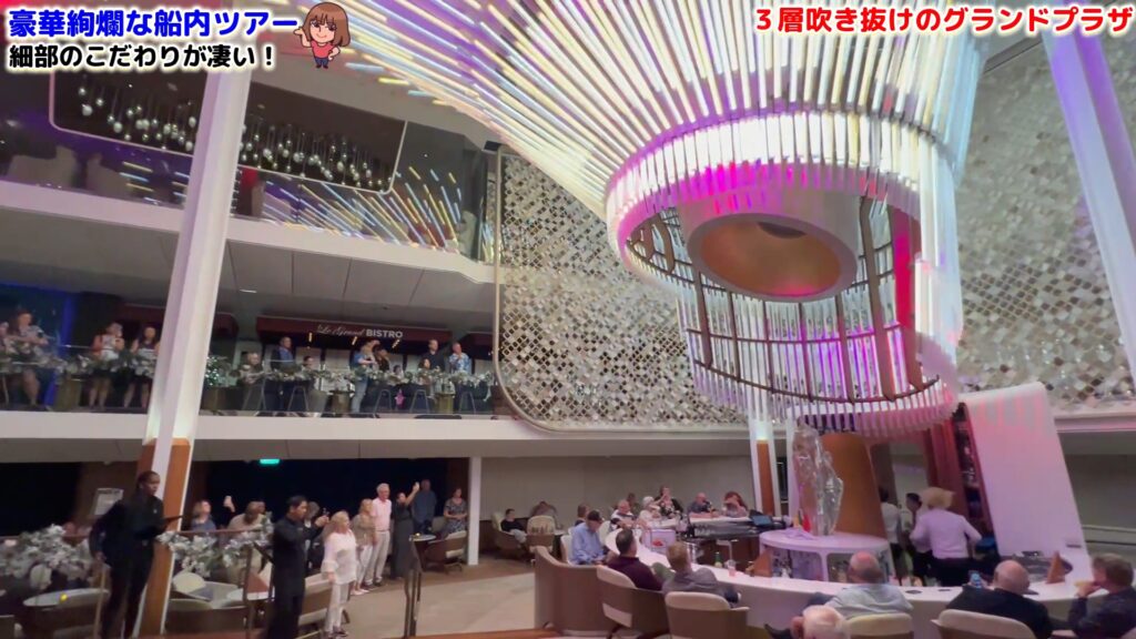 乗船するとまず目に飛び込んでくるのが「グランドプラザ」。このエリアのシンボルは、中央にそびえるマティーニバーと、その上に輝く巨大なシャンデリア。