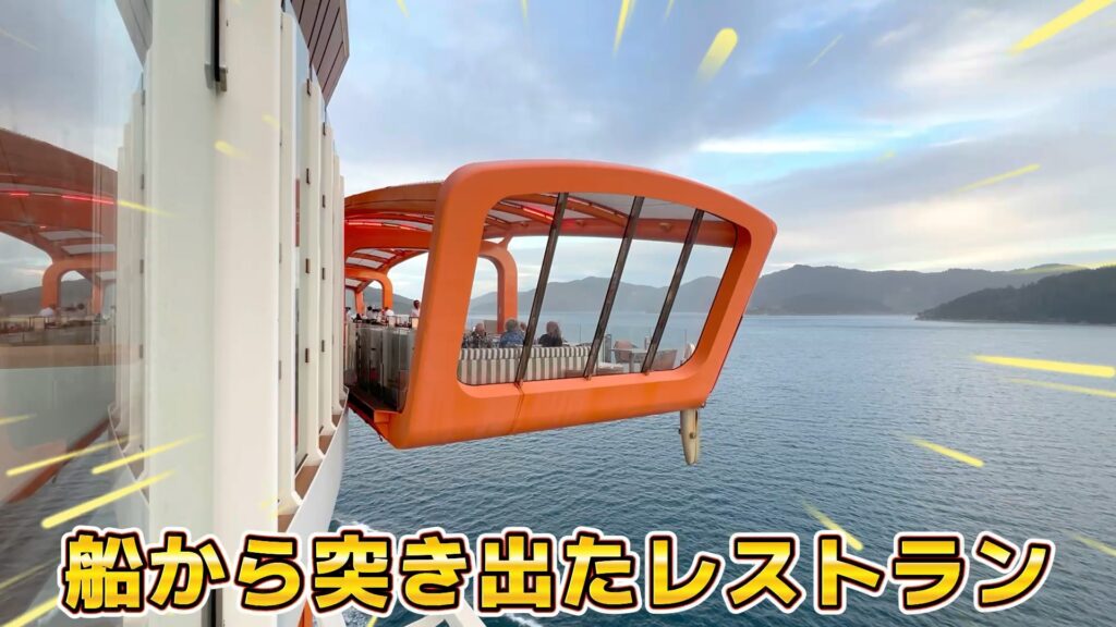セレブリティ・エッジの象徴ともいえる「マジックカーペット」。これは、船の側面を上下に移動するプラットフォームで、レストランやバーラウンジとして利用されます。