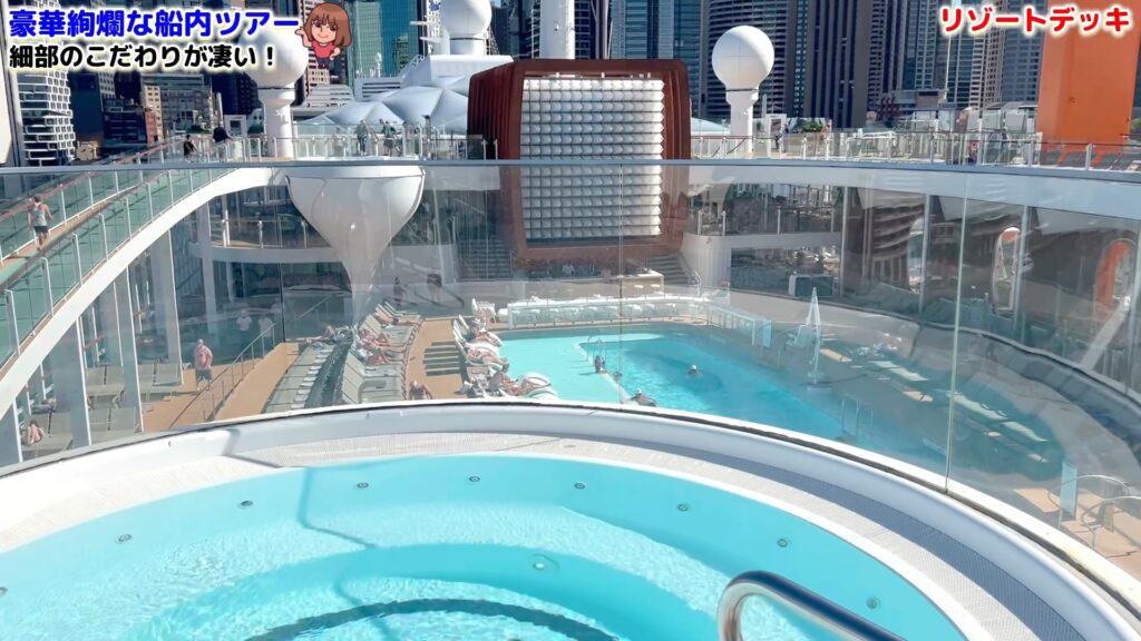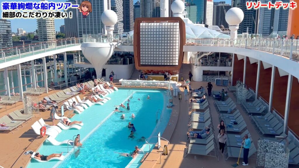セレブリティ・エッジの屋上デッキは、まるでリゾートホテルのプールサイドにいるかのような洗練された空間。