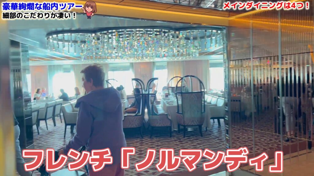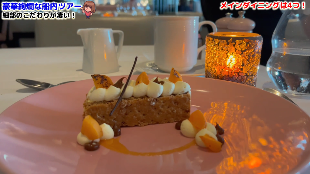 クラシックなフランス料理を堪能できる「ノルマンディ」。エレガントな雰囲気の中で、ダックコンフィや海老のビスクなど、伝統的なフレンチメニューが並びます。特に印象的だったのは、見た目も美しいデザート。食器まで美しく、贅沢なディナーを楽しめました。