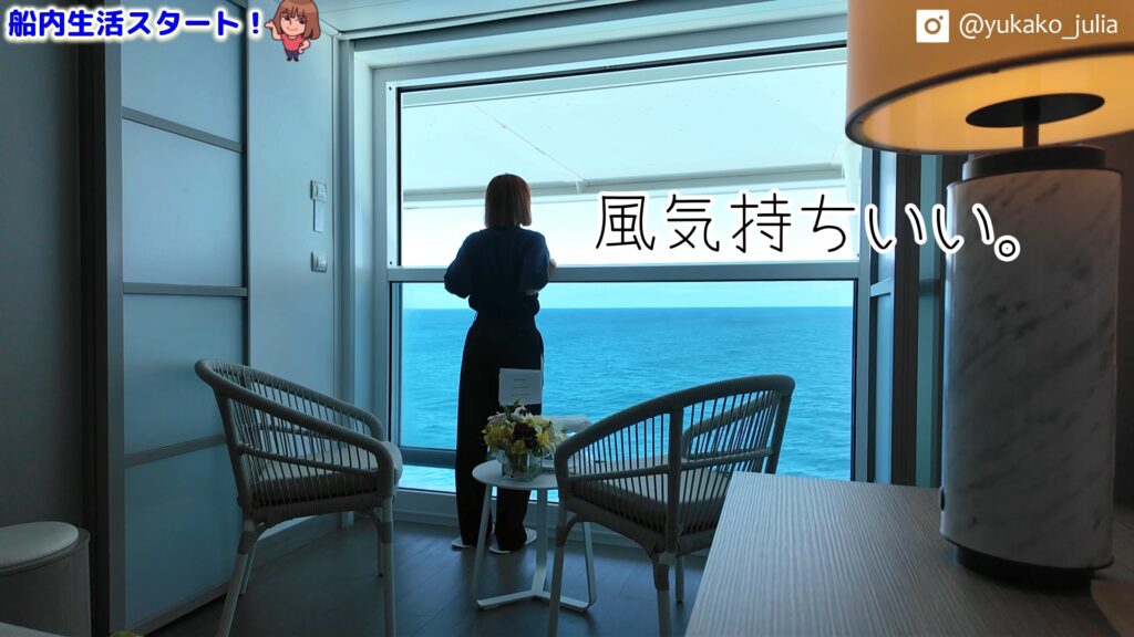 今回のクルーズで私が宿泊したのは「インフィニットバルコニー」の客室。この客室の最大の特徴は、バルコニーと室内が一体化しており、ボタン一つで窓が開閉できる開放的な空間であること。これまでの客船のバルコニー付きキャビンとはまったく異なる体験です。