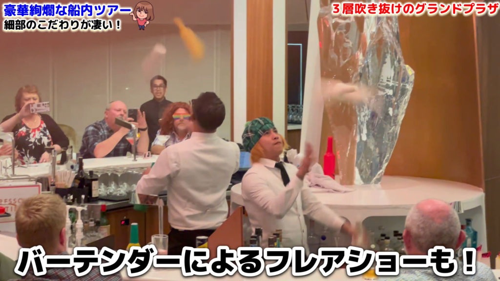 このシャンデリアには特別なセンサーが備わっており、外の明るさに合わせて光の表情が変化します。夜10時には音楽に合わせたシャンデリアショーが行われ、バーテンダーの華麗なパフォーマンスも見どころの一つです。