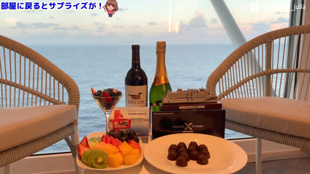 まず、乗船時のチェックインがスムーズ。専用のチェックインカウンターが用意されており、長蛇の列に並ぶことなくスムーズに船内へ。さらに、客室にはウェルカムスパークリングワインが用意されており、船旅の始まりを華やかに演出してくれました。