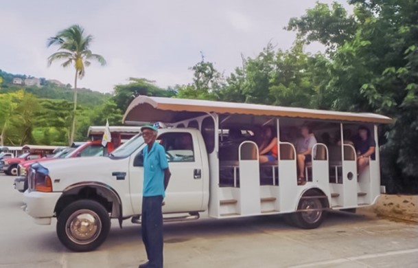 1dayツアーを申し込んでいたので、こちらのタクシーバスに乗り、細い道をくねくねと小高い山を登って景勝地、メイゲンズビーチがきれいに見えるビューポイントへ向かいました。