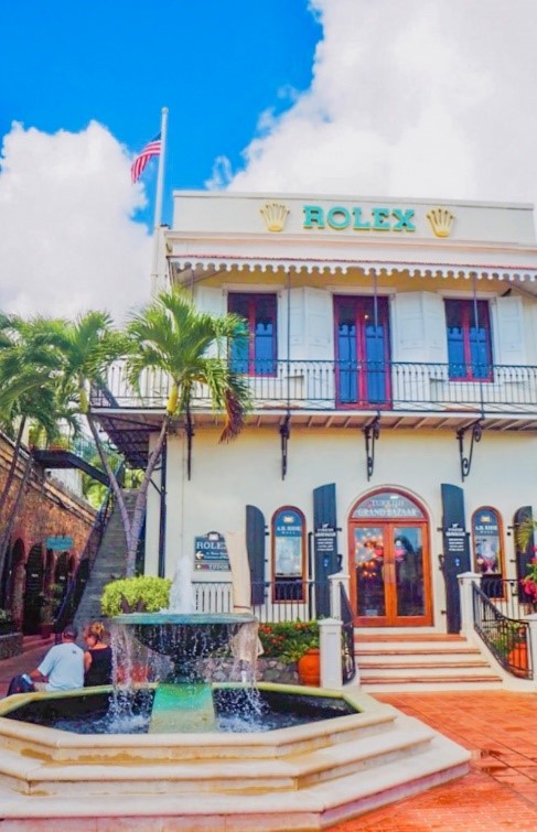 噴水が店前にあるロレックスの路面店、有名ブランドショップやオパールのブティックが立ち並んでいます。