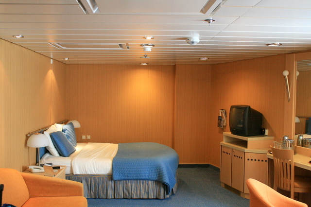 正直豪華客船のスタンダード客室は寝るためだけに作られているので、ビジネスクラスサイズだ。20㎡もない。(ただ本当に寝るとき以外あまり部屋に滞在することはなかったので、狭さは問題ではない。)