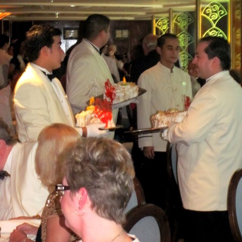 クルーズ最後の夜には、メインダイニングで「ベイクド・アラスカ」というイベントも開催された。ダイニングの照明を消し、ケーキにローソクの代わりに花火を挿し、ウェイターが全員パレードのようにダイニングを歩き回り、陽気にふるまうイベントだ。