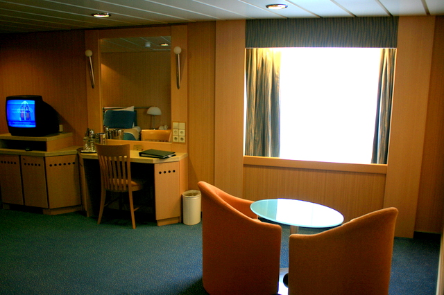 倍ほども価格の違うスカイスイートでも25㎡もない。1番価格帯の高いペントハウススイート程ではないものの、その次のスイートと同等の広さはあったかもしれない。(ただスイートクラスは一番下のクラスでも専用のバトラーがお世話をしてくれたりとお値段相応のサービスがあるので、あくまで広さだけの話だと思ってほしい。)我々の部屋は船尾なので船首に比べて揺れも小さめで、圧迫感もなく非常に快適だった。