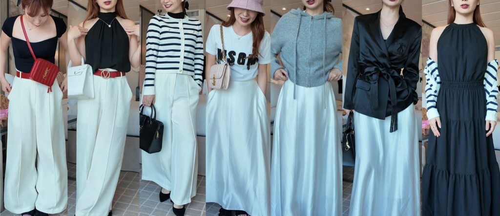 クルーズでは荷物をなるべく少なくするため、着回しが重要です。今回もスーツケース1つで済むよう、同じワイドパンツを使ってトップスを変えることで、カジュアルな日中のスタイルからエレガントな夜の装いまで幅広く対応できるコーディネートを考えました。荷物を少なくできるので、ぜひ「着回し」を意識してコーディネートを組んでみてくださいね。