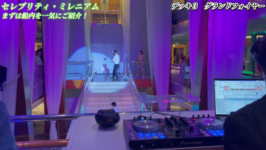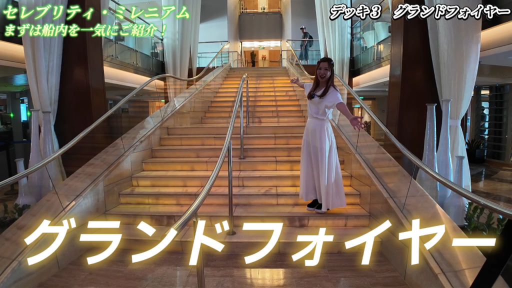 「セレブリティ・ミレニアム」の船内は、どこを歩いても美しい空間が広がっており、特に船の中心部に位置する「グランドフォイヤー」は3階吹き抜けのデザインで、夜にはライトアップされ、音楽演奏も行われる華やかな場所です。