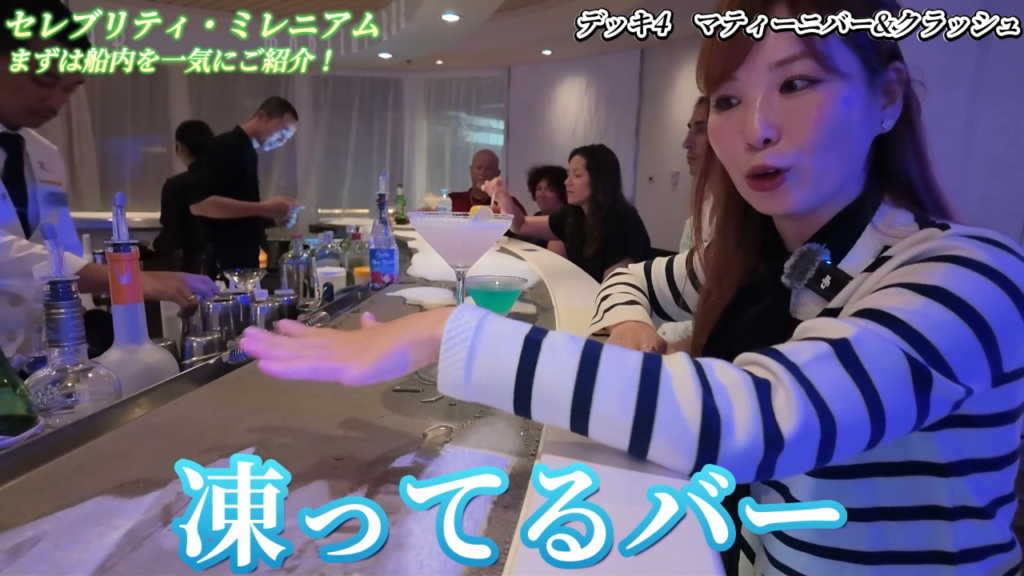 さらに、「セレブリティ・ミレニアム」には、さまざまなバーやレストランが揃っています。特に人気が高いのが「マティーニバー」で、バー全体が氷で作られており、冷たいマティーニを楽しむことができます。