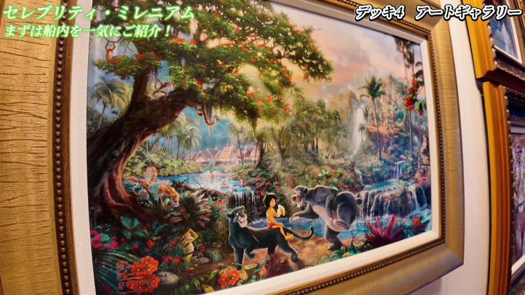 また、船内には「アートコーナー」があり、ここでは多数のアート作品が展示されています。日替わりで展示内容が変わるため、ゲストたちは毎日違った作品を楽しむことができます。展示されているアートはすべて購入可能で、多くのゲストが思い出にアートを買って帰ることが一般的です。ディズニーの作品も多く、ミッキーやミニー、ライオンキングなどのキャラクターアートが並んでいます。