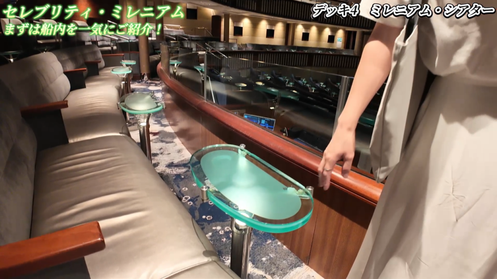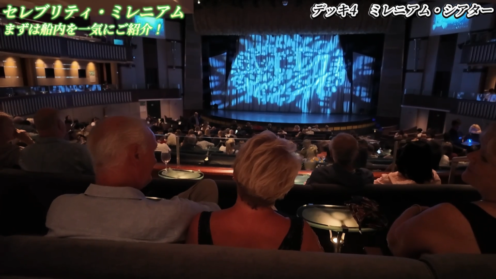 「セレブリティ・ミレニアム」のシアターも大きな魅力のひとつです。このシアターは非常に重厚感のあるデザインで、席にはライト付きのテーブルが設置されており、オペラ座のような雰囲気があります。