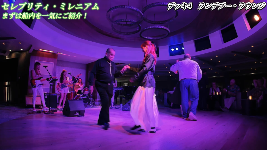 ラウンジにはピアノやバンドの設備が整っており、夜にはゲストたちがダンスを楽しむ場として利用されています。今回、私は日本人の常連客の方にダンスを教わり、社交場デビューを果たしました。