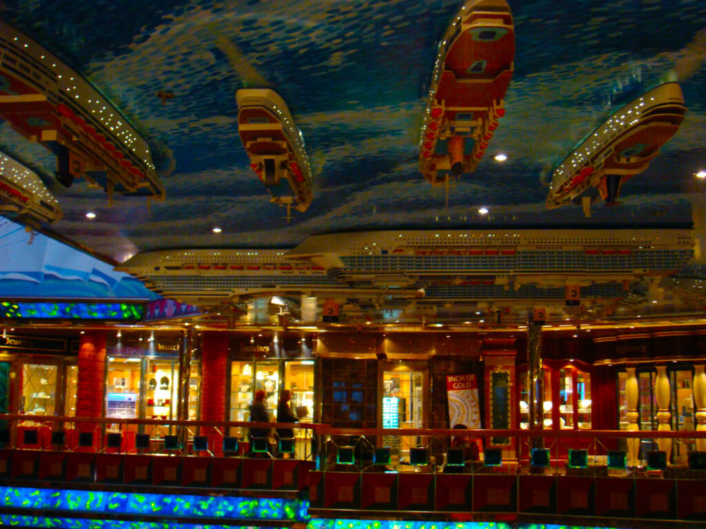 吹き抜けになっていた天井は大海を模しており、コスタ・クルーズが所有する船の模型が運行する…という遊び心のあるインテリア。