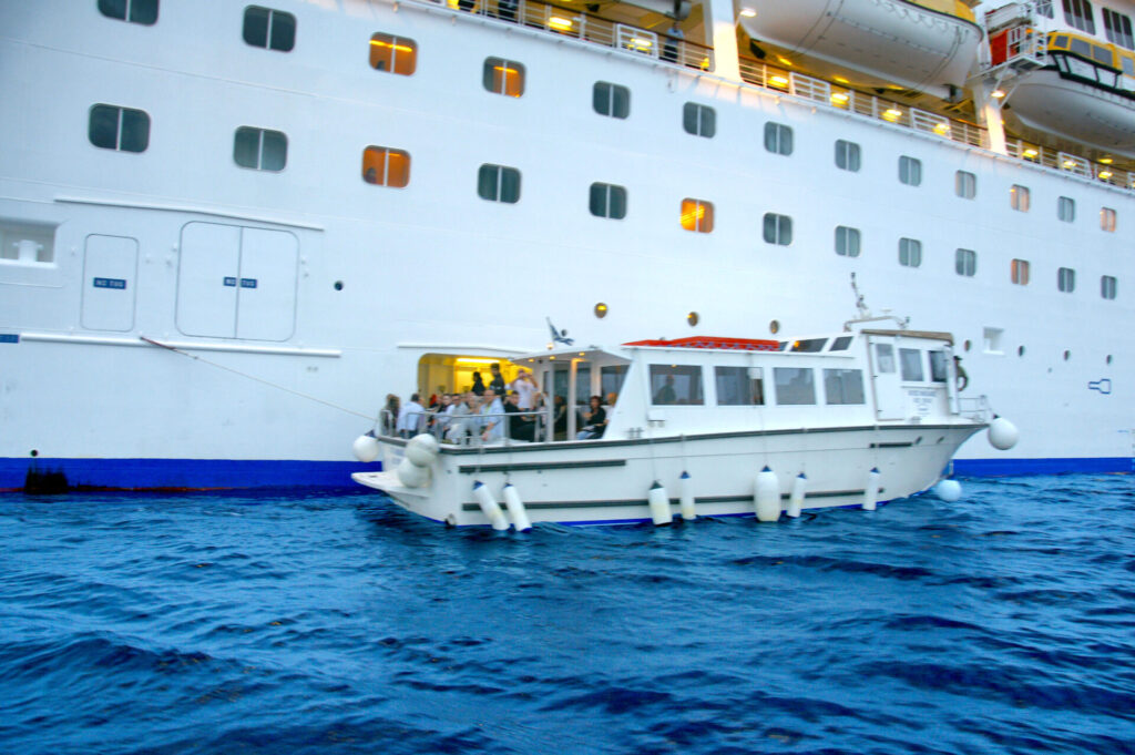 大型船はエーゲ海の小さな島にある港に船をつけられないので、乗客は「テンダーボート」という小さな船に乗って港に移動します。