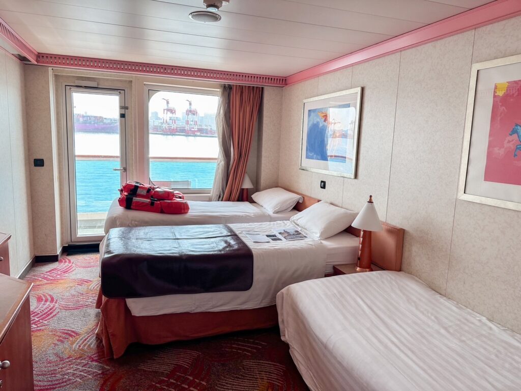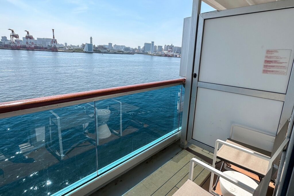お部屋は海をたっぷり感じられるバルコニー付きがおすすめ!子連れクルーズでは、お昼寝時間をお部屋で過ごしたり、夜も早めに就寝することも多いのでお部屋でもクルーズ気分を味わえるバルコニー付きのお部屋を選びました。