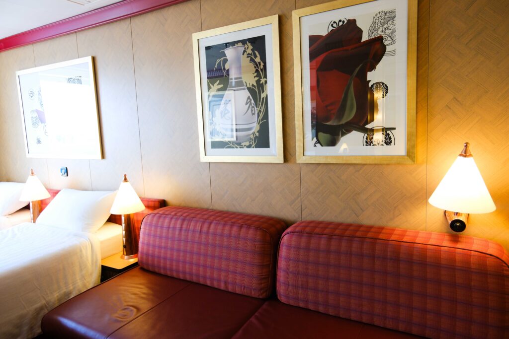 陸上にある自分の部屋より広くて、ソファー、テーブル、化粧台、洗面所、トイレ、シャワー、ドライヤーがあります!バスタオルも毎日変えてもらえます!