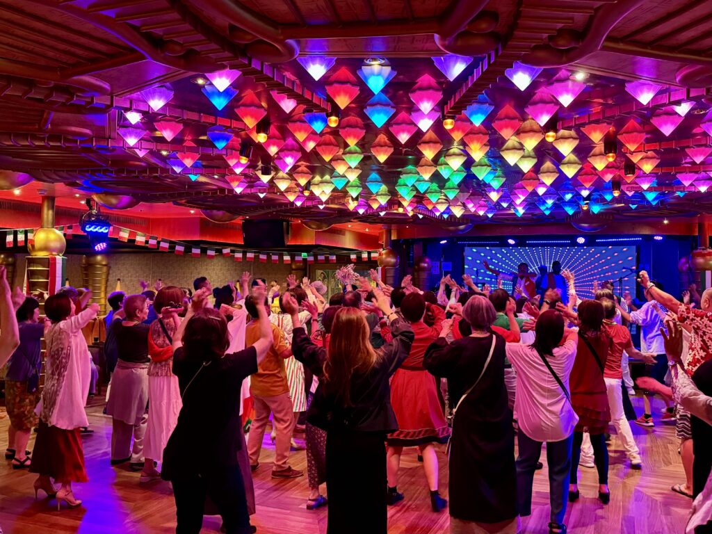 船内のホールに集まった乗客たちが、DJのリズムに乗りながら、体を揺らし楽しみました。船内のダンサーたちがリードするダンスに混じったり、まるでイタリアにいるかのような一体感を味わうことができました。