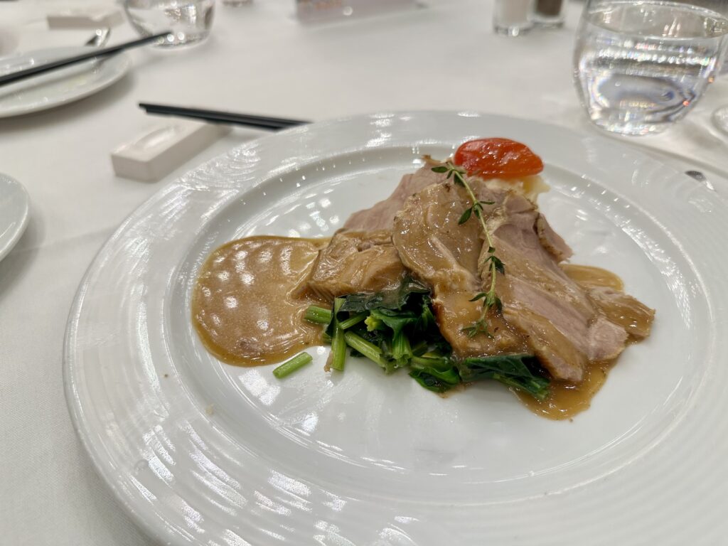 船内レストランでのディナーは、コース形式で提供され、スターター、メイン、デザート、そして「グレートクラシック」から好きな料理を好きなだけオーダーできました。