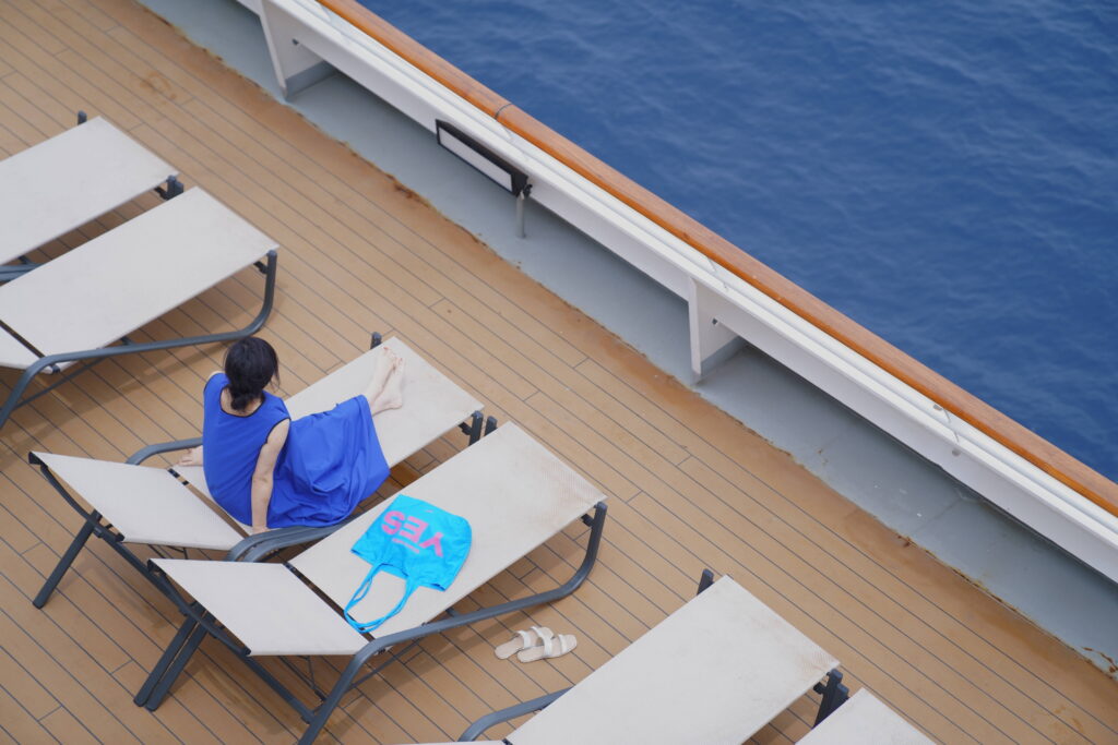 目が覚めてデッキへ移動すると、そこは大海原であることを再確認し、改めてクルーズ旅行していることを噛み締める。