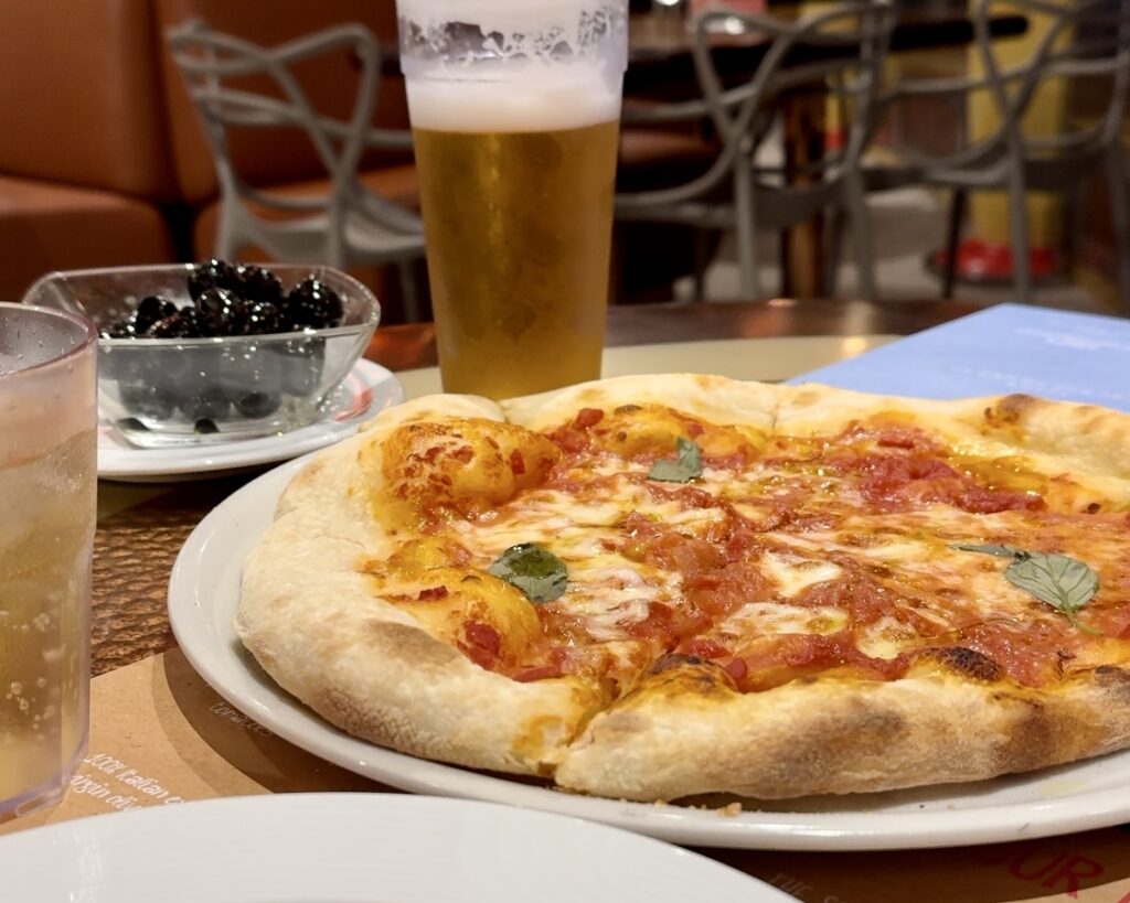 そして0時まで営業しているイタリアンレストランで夜食にピザを味わう。さすがイタリア船!本格的なマルゲリータ、夜にちょっと小腹が空いた時に助かりますね。