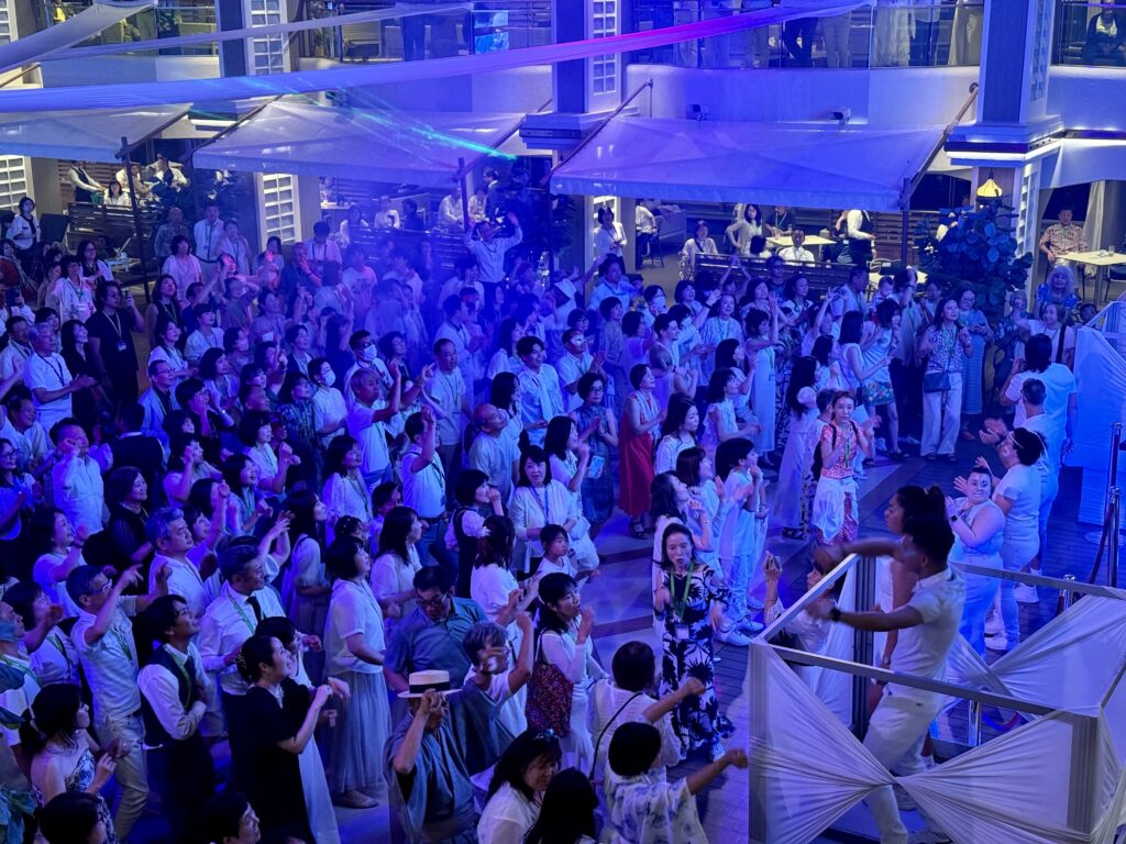 シアターではウクライナ元オリンピック選手による幻想的なステージを楽しみ、ホワイトパーティーではプールサイドでのダンスタイムが大盛り上がり。充実した一日を締めくくりました。