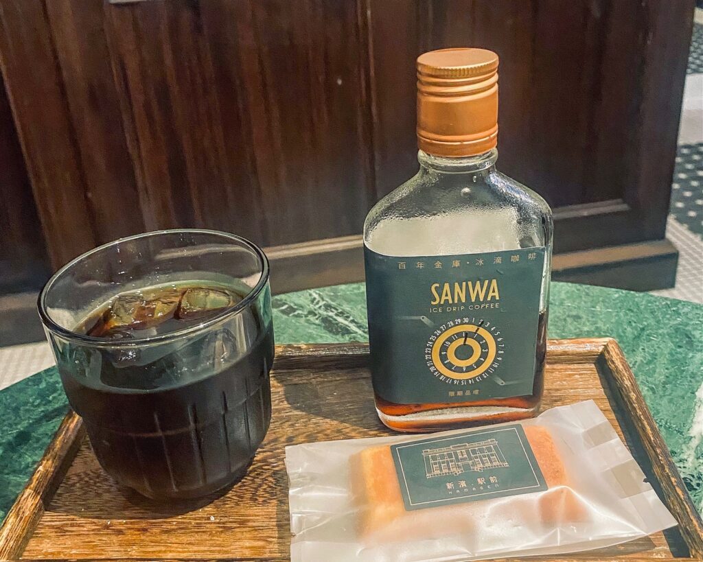 私が注文した金庫冰滴珈琲(Ice Drip Coffee) は、SANWA とラベリングされたガラス瓶で運ばれ、まるでお酒を飲むような印象のコーヒーです。金磚費南雪という名前のフィナンシェが付いてきます。(フィナンシェ付で1000円弱)