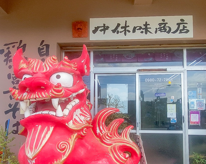 サクッと食べられるお店がよいとリクエストしたところ、観光客や有名人も多数来店されるなかやすみ商店へ。店前の大きな赤いシーサーが目印のお店です。
