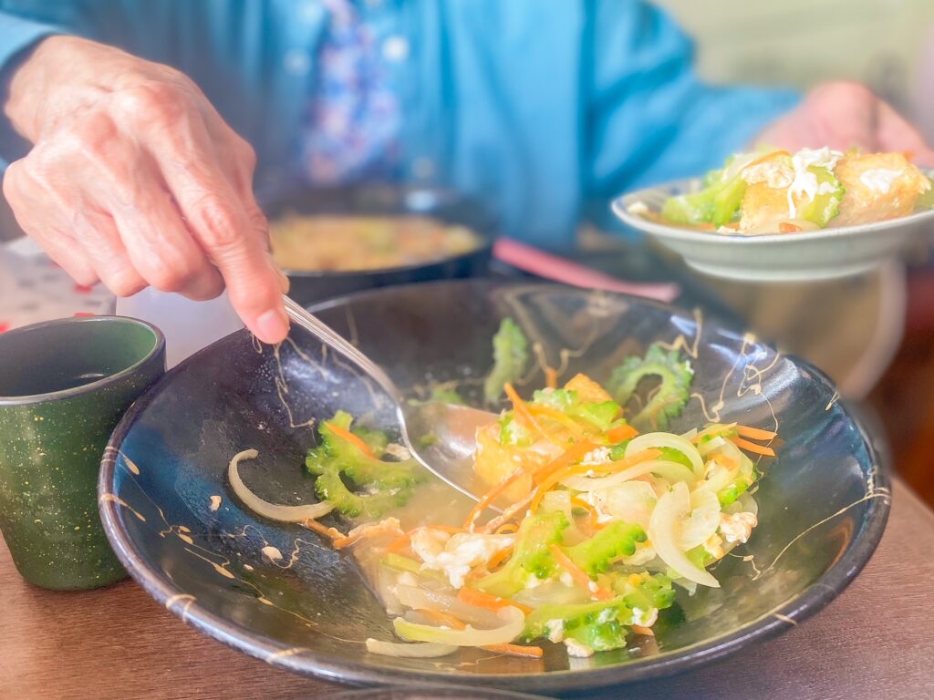 定食メニューもありますが、沖縄そばとゴーヤチャンプルーに。