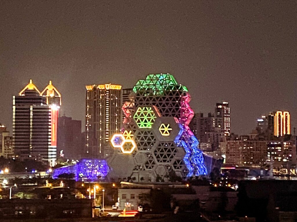 高雄港の出港は21時。日中は真っ白の建物だった高雄流行音楽中心はライトアップされてカラフルに。