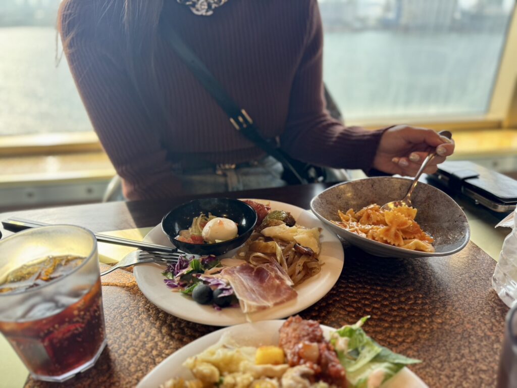 和食・洋食・中華・韓国料理など幅広いメニューがありますが、さすがはイタリア船!私はイタリアンが一番美味しいと思いました。モッツァレラやパスタなど、乗船した際には是非試してみてください。