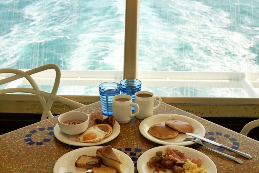 2日目の朝は1日目に張り切って夜更かしをしてしまったので、遅めの朝食。船尾の席を確保し船跡波を眺めながらゆっくり過ごしました。
