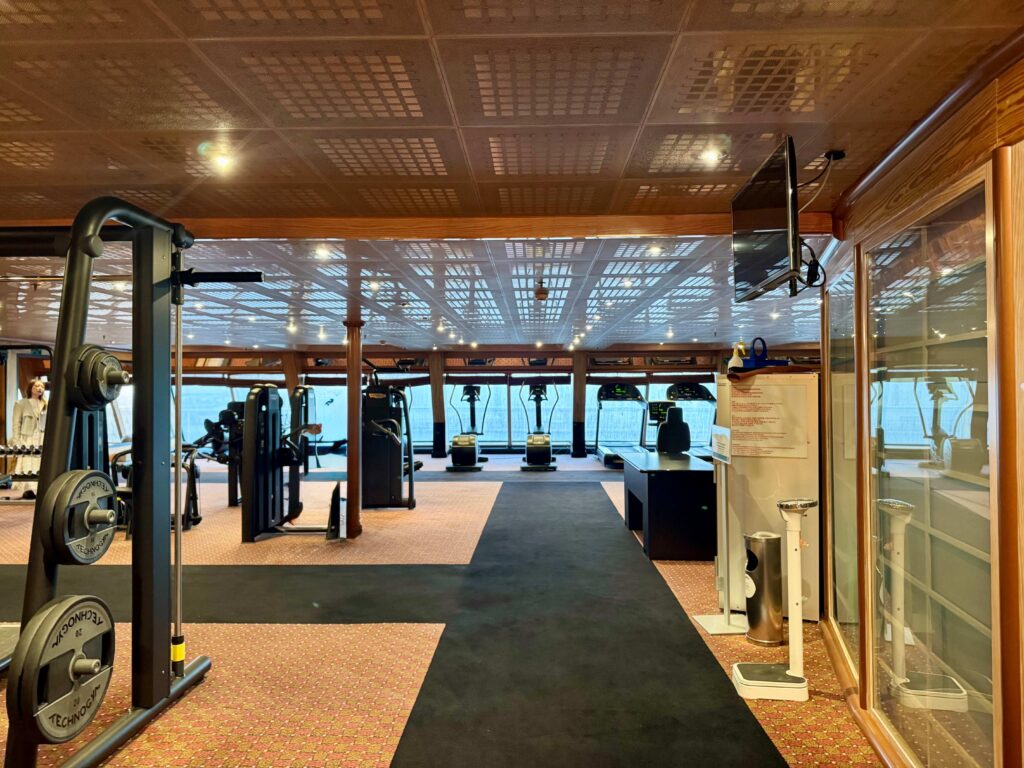船首に位置するジムでは、進行方向の海に向かって走ったり、トレーニングをすることができます。全面ガラス張りで気持ちの良い空間でした。